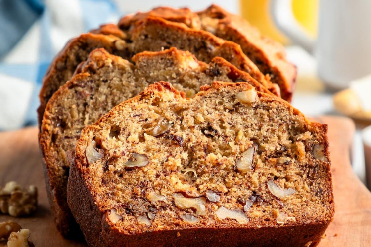Moist homemade banana bread made with ripe bananas and crunchy walnuts, baked to perfection for a rich flavor and soft texture in every slice.